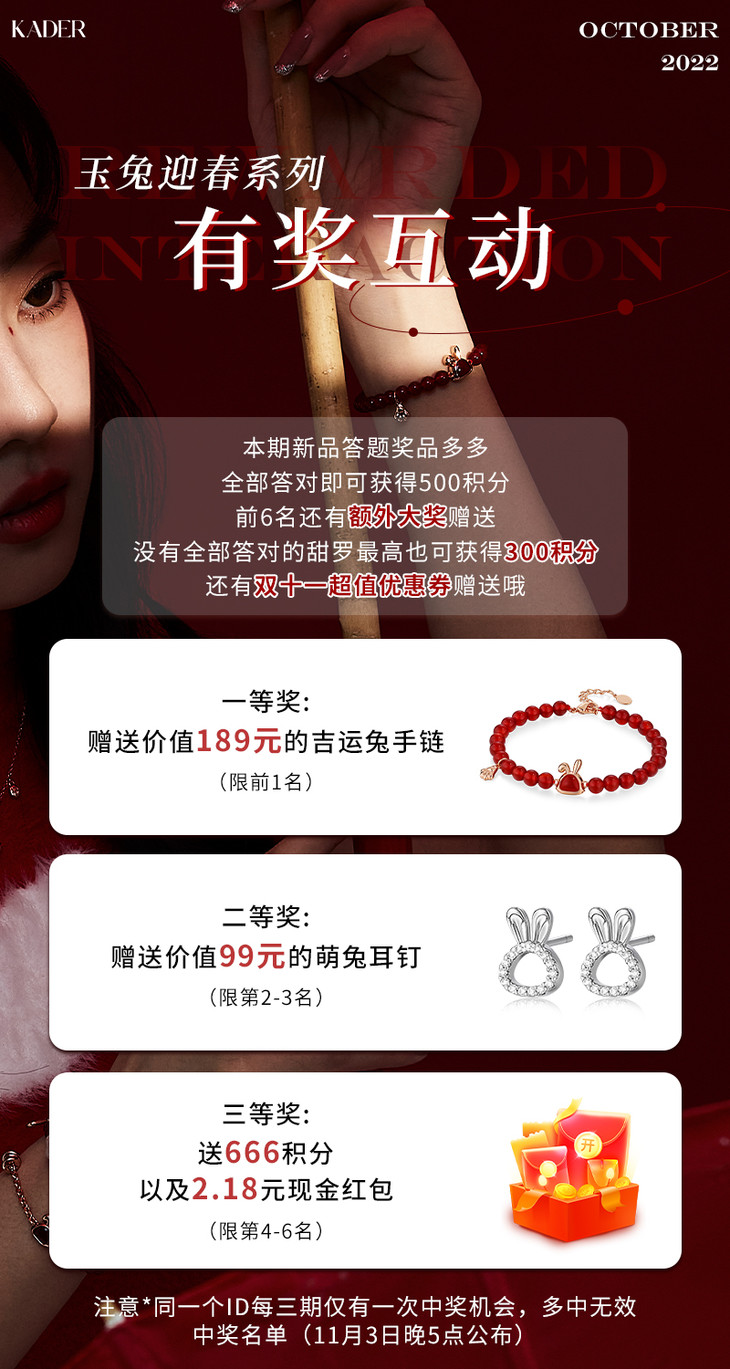 一等奖:送价值189元的吉运兔手链(限第一名)