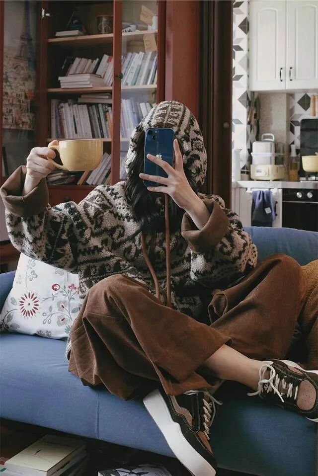 复古的几何纹、线条交织、红的鲜活、棕的温暖,搭配暖暖厚实的仿羊羔毛,又有层次感。