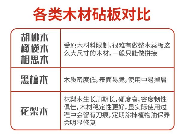 花梨木,密度在0.83--0.98g/cm,属于“适中偏上”,很适合做菜板。用它做菜板不易变形,有股淡淡香气。 使用过程中基本不伤刀,不易掉屑!