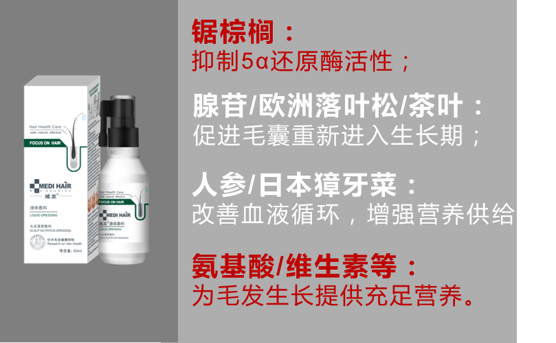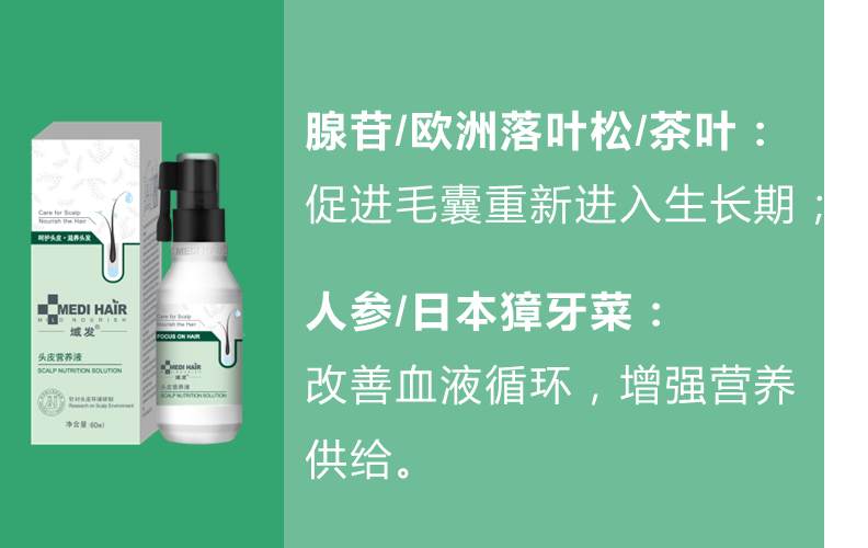 域发头皮营养液中含有的腺苷/欧洲落叶松/茶叶成分,能够促进毛囊重新进入生长期;而人参/日本獐牙菜提取物,能够改善血液循环,增强营养供给,促进头发长的粗壮茂密。