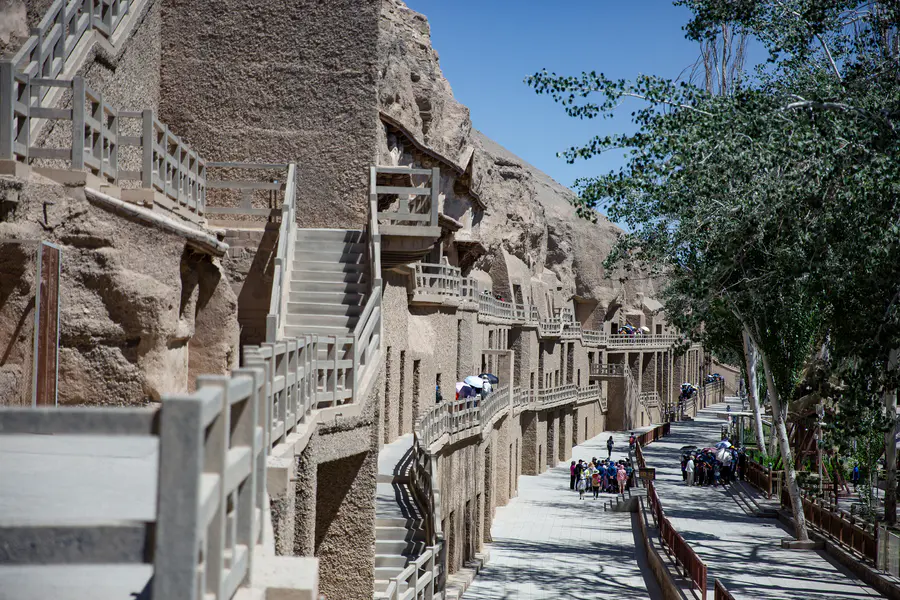 【上午】早上9点钟用完酒店早餐后,我们便直接前往莫高窟入窟参观。按照景区的要求,在进入莫高窟入窟之前,我们需要先在购票中心隔壁的观影中心观看两场数字球幕电影,了解关于莫高窟的基本背景知识。然后乘坐景区提供的专用大巴车进山游览。