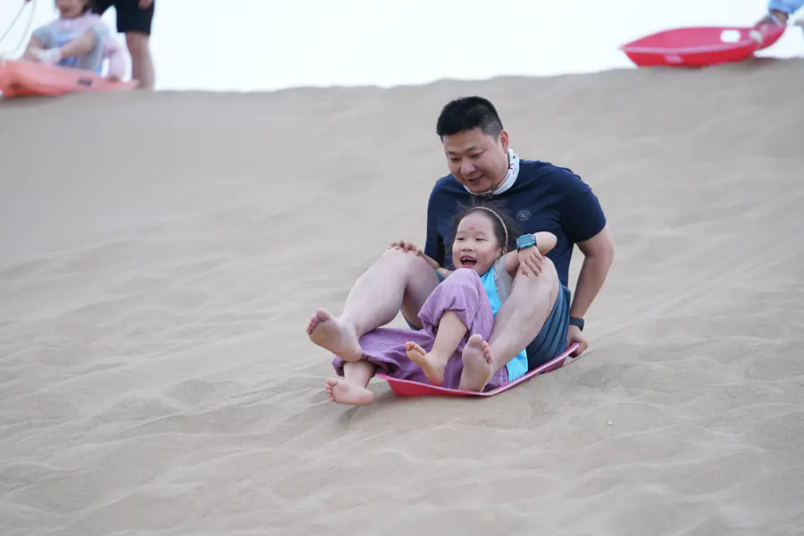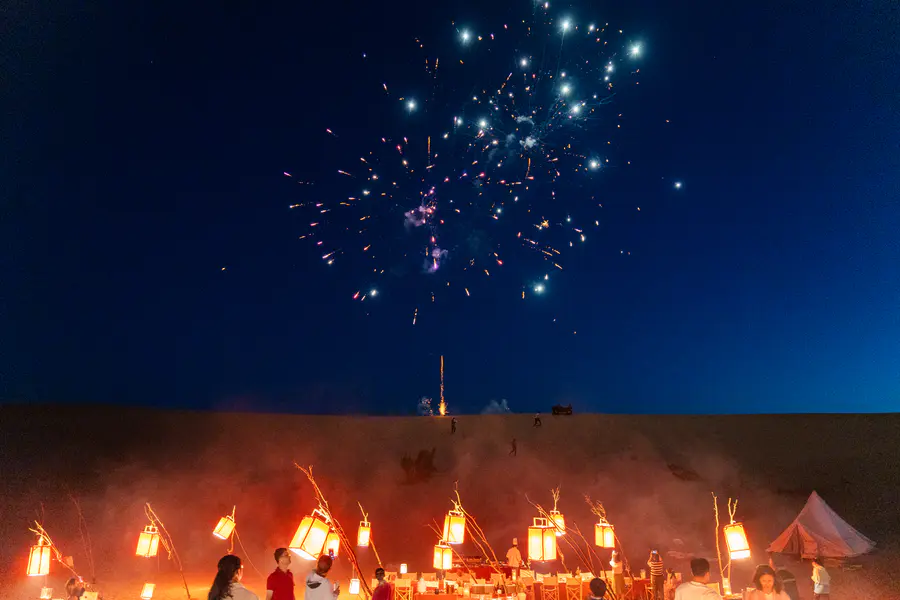 【傍晚】下山后,我们直接乘车前往野孩子位于鸣沙山后山的私家营地。在这里,工作人员已经为大家准备好了丰盛的晚宴。我们可以在这片没有外人干扰的沙漠里,自由地骑骑骆驼、玩下滑沙(需自费),而不用像景区里那样排队等待。