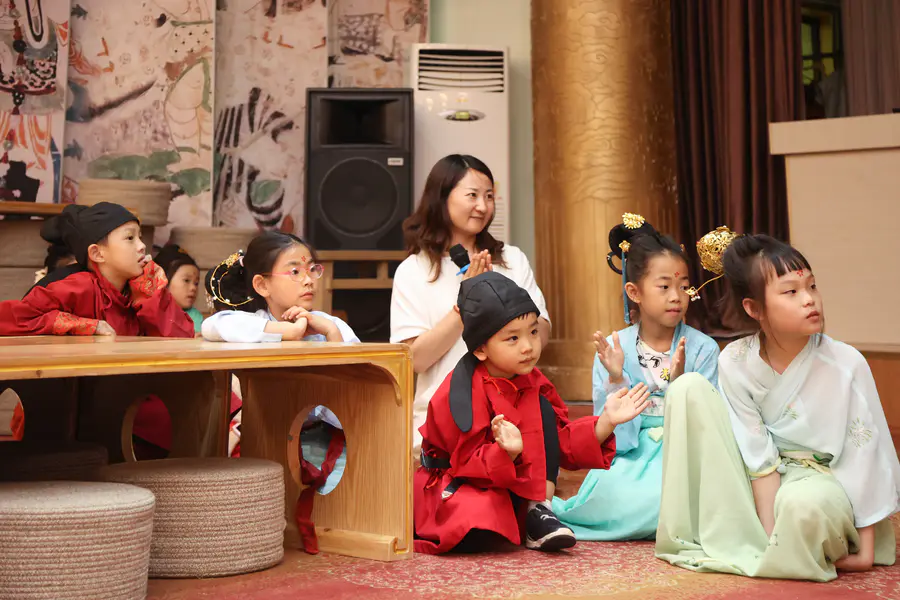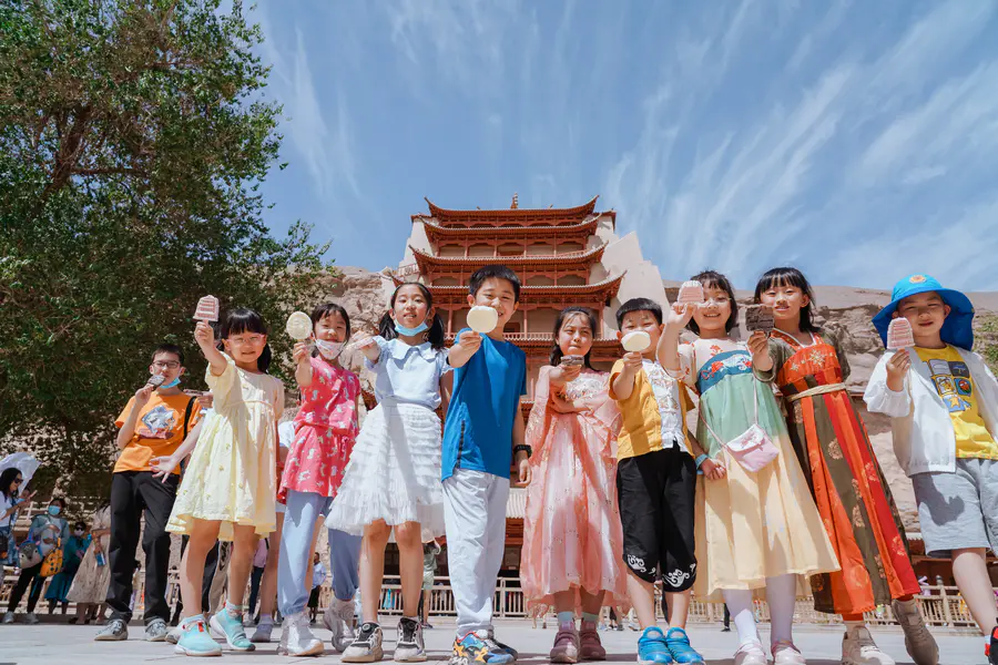 【下午】用过午餐后,客人们大、小朋友会短暂分开,小朋友去往敦煌研究院-莫高学堂上一节由研究院的金牌老师主讲的“敦煌壁画中的古代服饰”课程,还会给小朋友们换上古代的衣服、扮上古人的妆容、换上古人的发饰,学习古人的礼仪。爸爸妈妈们则回酒店办理入住,待小朋友们课程结束,再统一回到学堂,观看小朋友们的汇报演出。