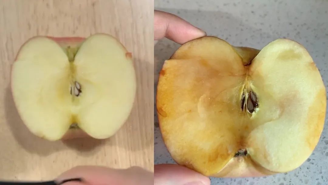 加热取出后,可以看到贴眼膜的这半边苹果依然水盈盈的,并且没有氧化,而未贴的却明显氧化干皱。