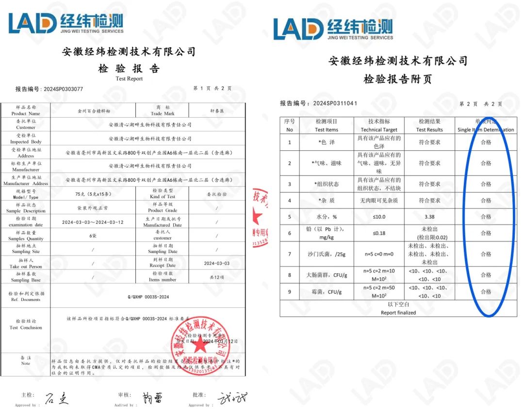 为了让我们吃得放心,产品还通过了层层严苛的检测,各项指标均符合食品标准!
