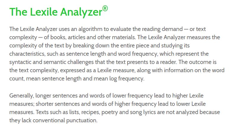 基本意思就是一个文本的蓝思难度是通过内部的算法实现的,而这个算法的考虑方面包括:句子长度、用词的高低频率等。