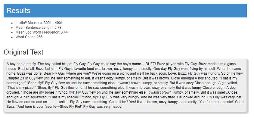 我又试了一下"Hi, Fly Guy"的文本,最后得出的难度值是"300L-400L"。