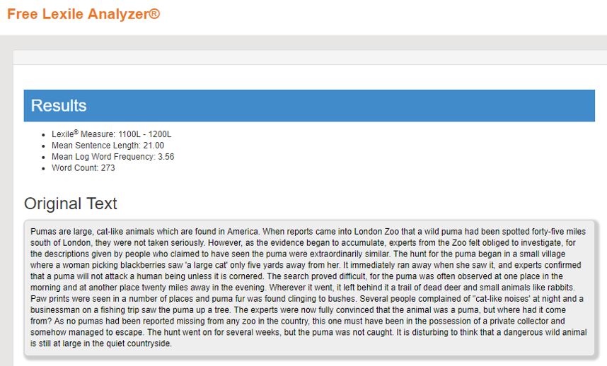 我把《新概念》第三册第一课"A Puma at Large"输入了系统,发现并不简单,难度也有1100L-1200L。差不多相当于AR的8.0-9.0的难度。
