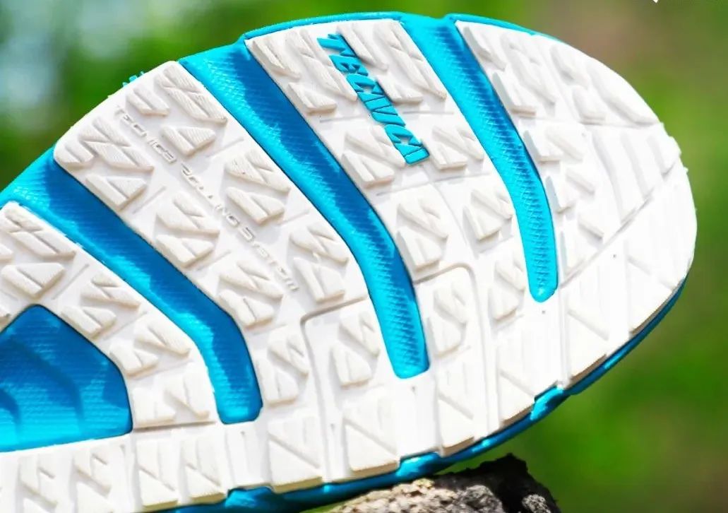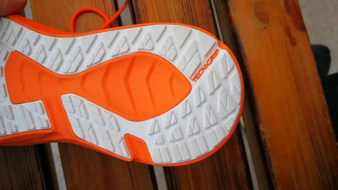 大底采用的是Tecnigrip®城市路跑大底,大底花纹分布细密拥有更多的接触面积,排水弹性凹槽增加了鞋子的灵活性,在拐弯的时候也不影响节奏,提升多地形的抓地力。Tecnigrip®专业大底+TRS滚动系统,像一台精密的组合仪器,为跑者提供优秀的抓地性能和向前推动力。
