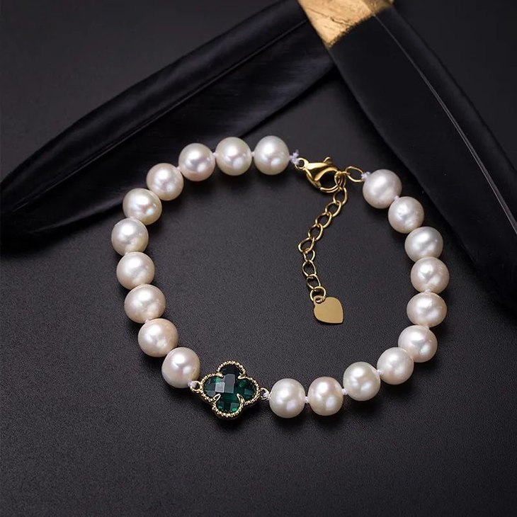滚圆可爱的珍珠粒搭配精致的人工祖母绿水晶,不似普通珍珠手链设计那么乏味。