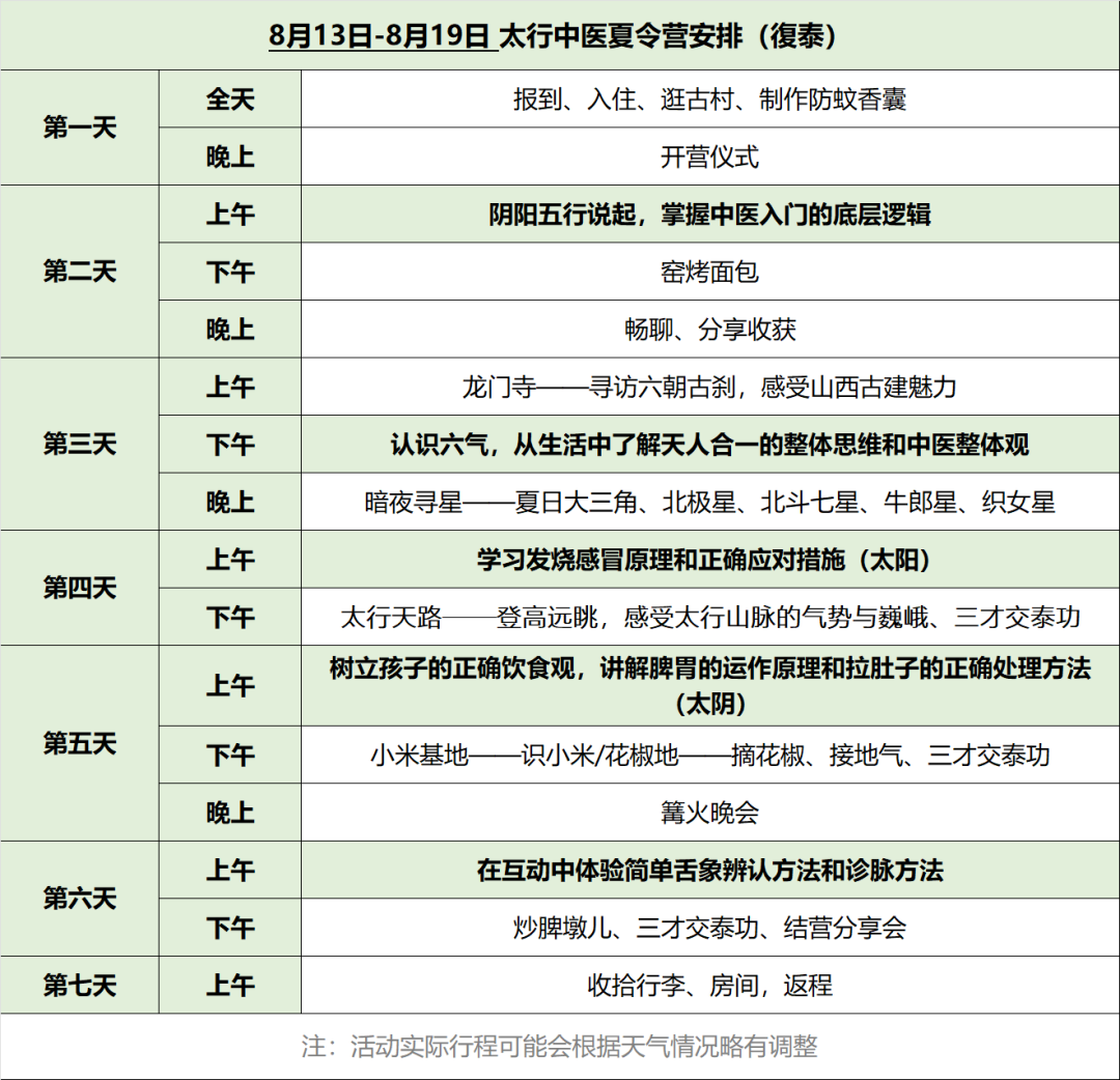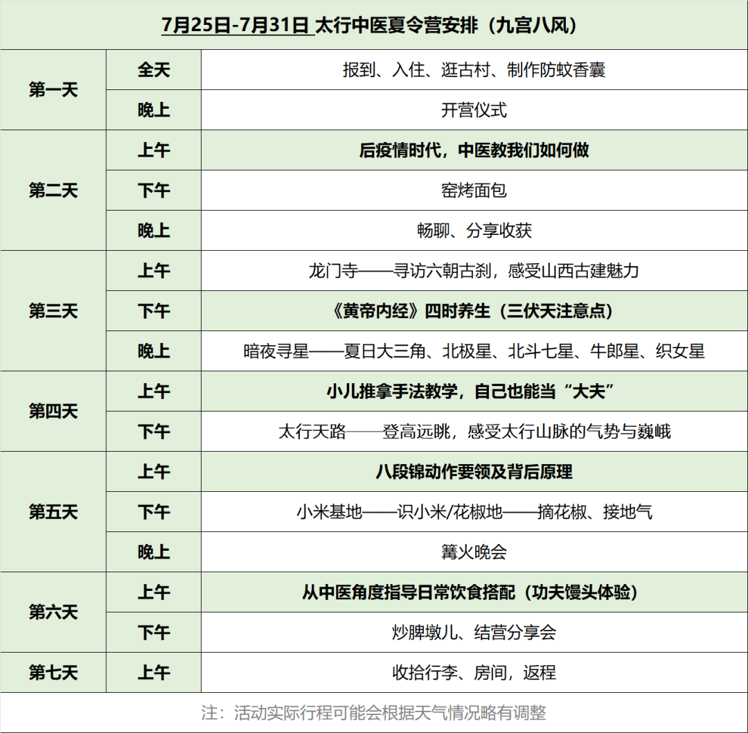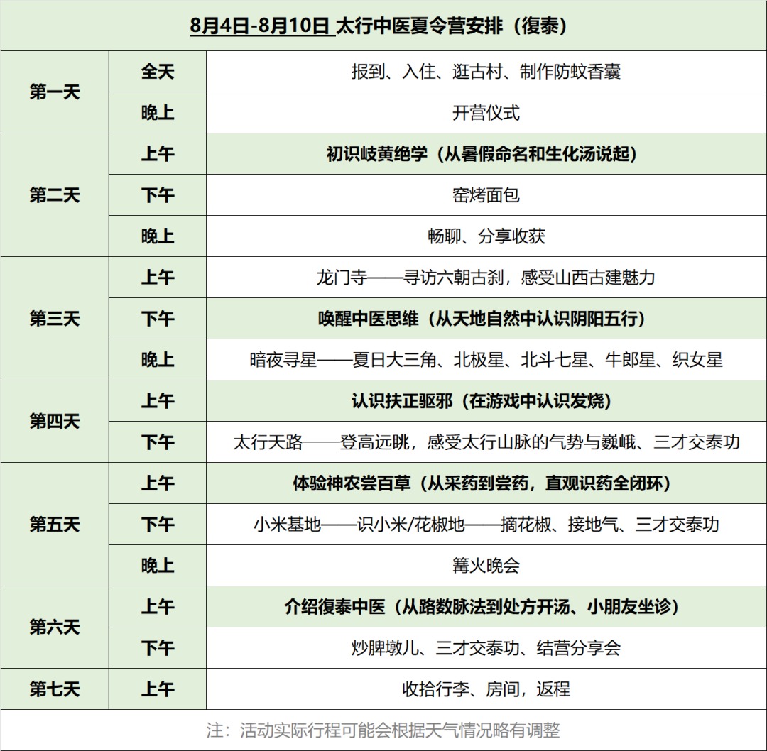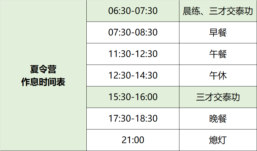 (注:第一天和最后一天为报道入营和结营,其他时间按照作息表上课,空余时间安排其他活动,如有调整另行通知。)