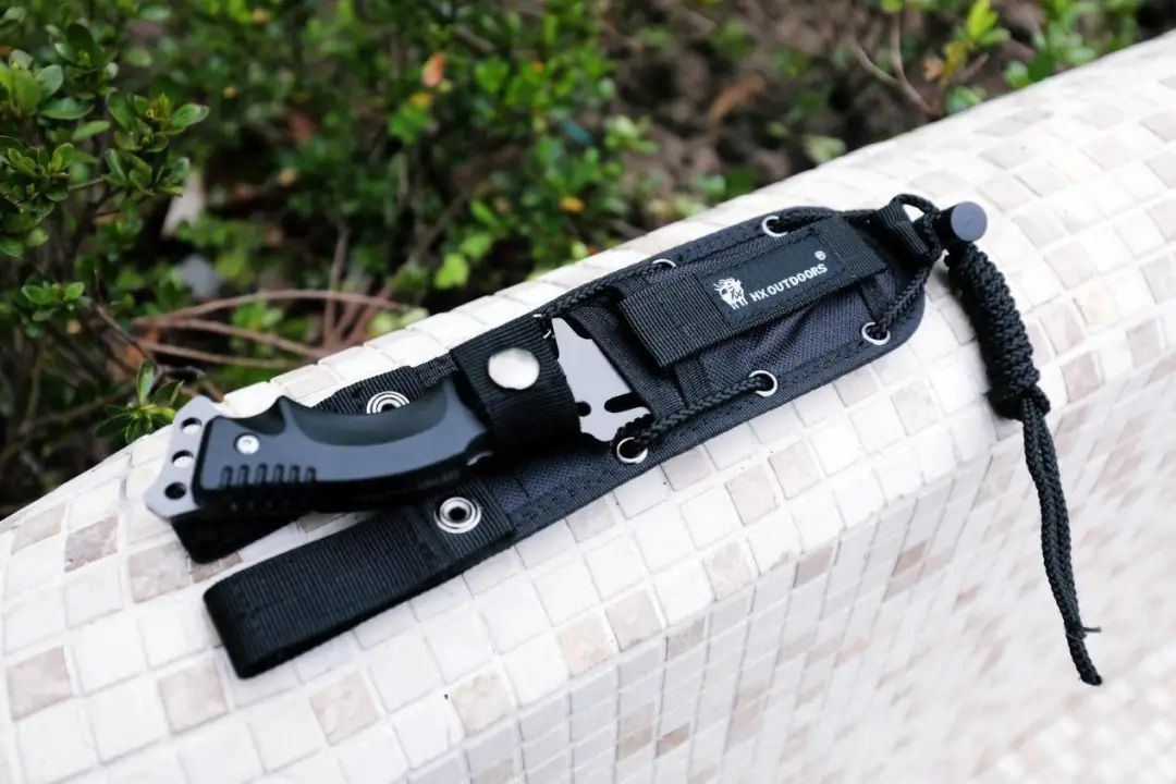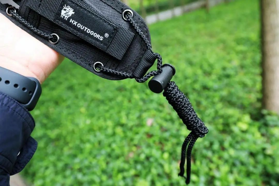在汉道刀具的尾部设置了绳孔,能够把绳子给穿进去拓展使用场景。而且还自带伞绳,也就是固定在尼龙战术套下面的绳子。