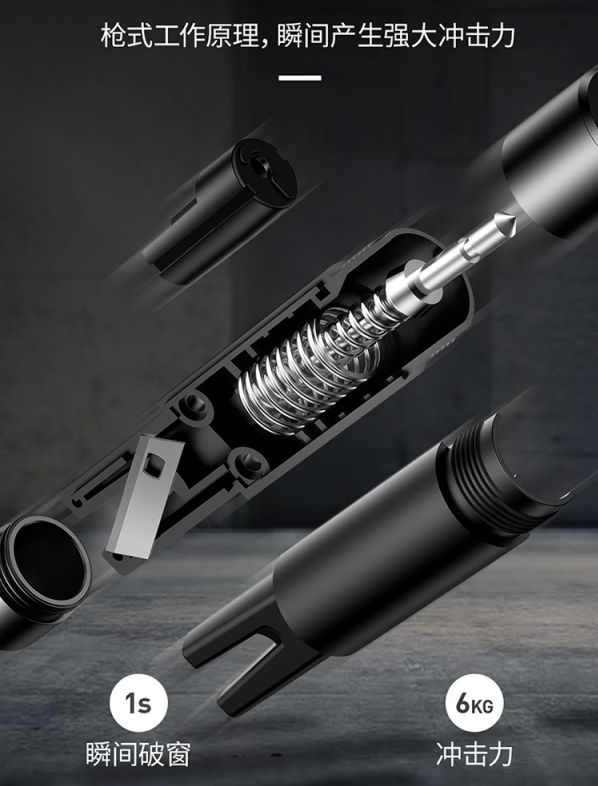 再加上枪式弹簧设计,对准窗户某个角,轻轻一按,瞬间产生强大的冲击力,一秒破窗!