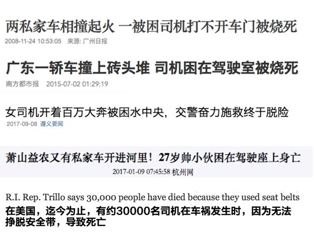 就像上面这些新闻中,死亡的原因往往是安全带卡死、车门变形,导致司机被困在车里。