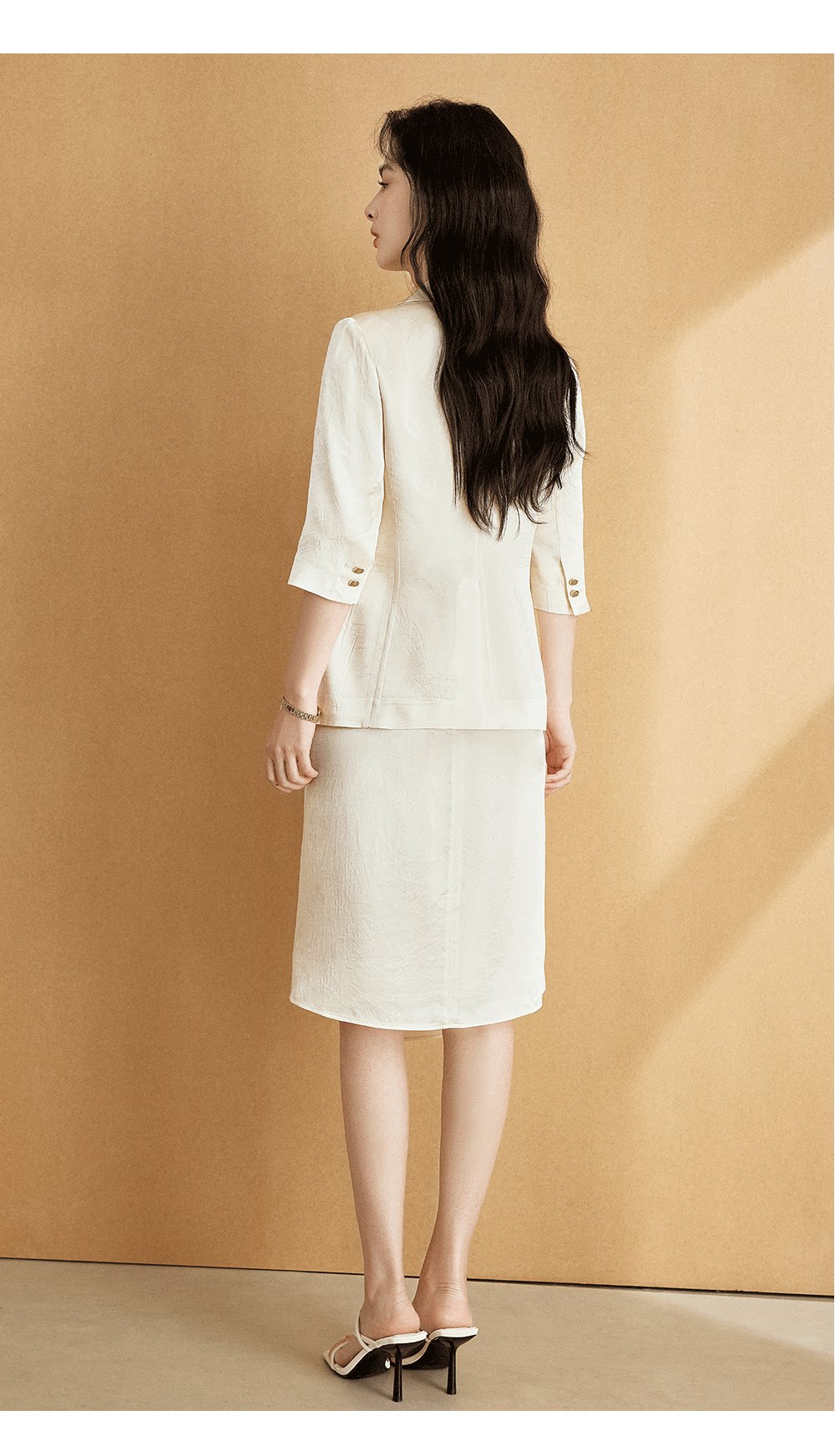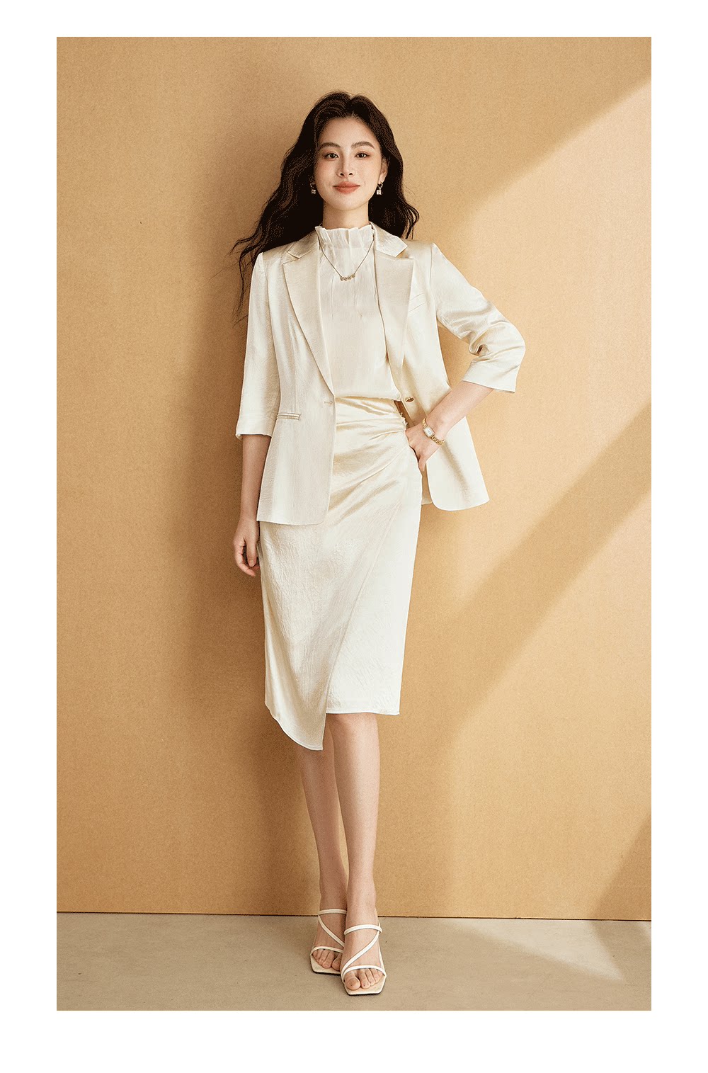 自带柔光滤镜的米白套装,把轻熟女性的魅力展现得淋漓尽致。西装的挺括中和了缎面的柔滑,刚柔并济,一眼就移不开目光。