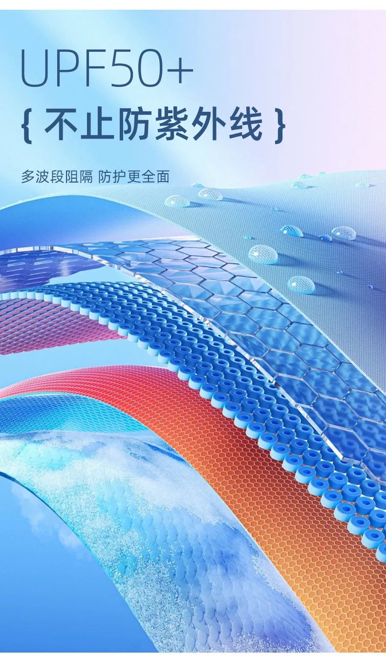 首先面料用的是3D云朵原纱锦纶,纺织过程中在纤维内添加抗紫外线物质,经过百次水洗,仍然能防住99%的紫外线,防晒力毫不衰减!!