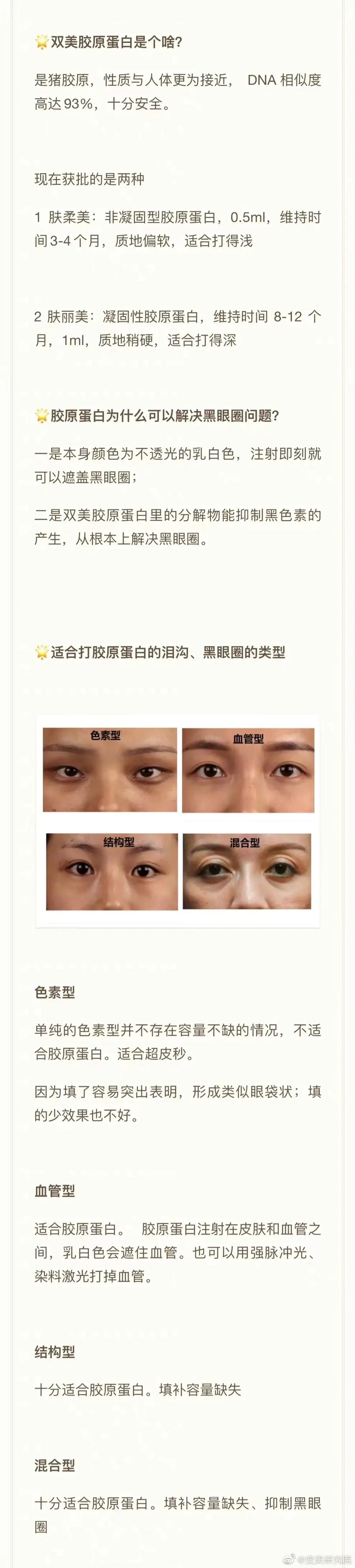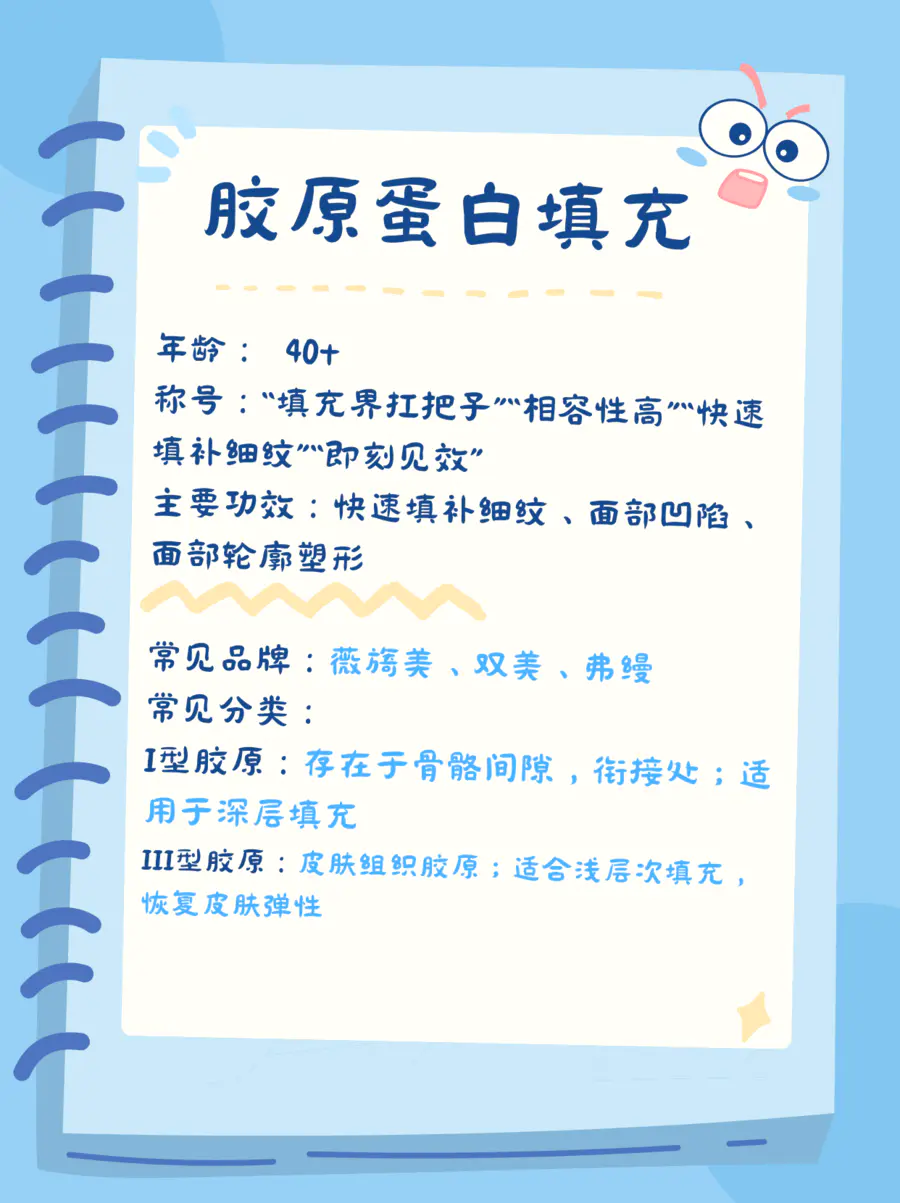 💡I 型胶原蛋白:原纤维直径呈条束状,相对坚硬,而且分子结构也更加稳定(质地比较硬),主要作为支撑纤维,对皮肤起着支撑的作用,使皮肤更加坚固。适用于填补面积较大的泪沟、法令纹、太阳穴等等。
