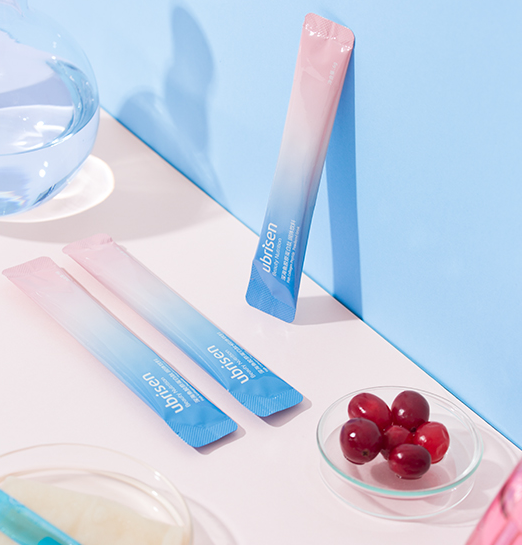 除此之外,你看它粉末是粉色的吧,因为里面还添加了北美进口蔓越莓,它是深海鱼肽的黄金搭档。