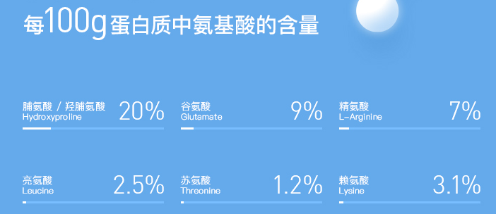 每100g中含有多种“美肌”氨基酸,稳定胶原蛋白合成率。