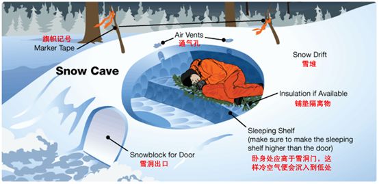 3、藏身在雪洞中很难让救援人员发现你,因此要记得在雪洞外留下颜色鲜艳,足以引起人注意的旗帜或其他记号。