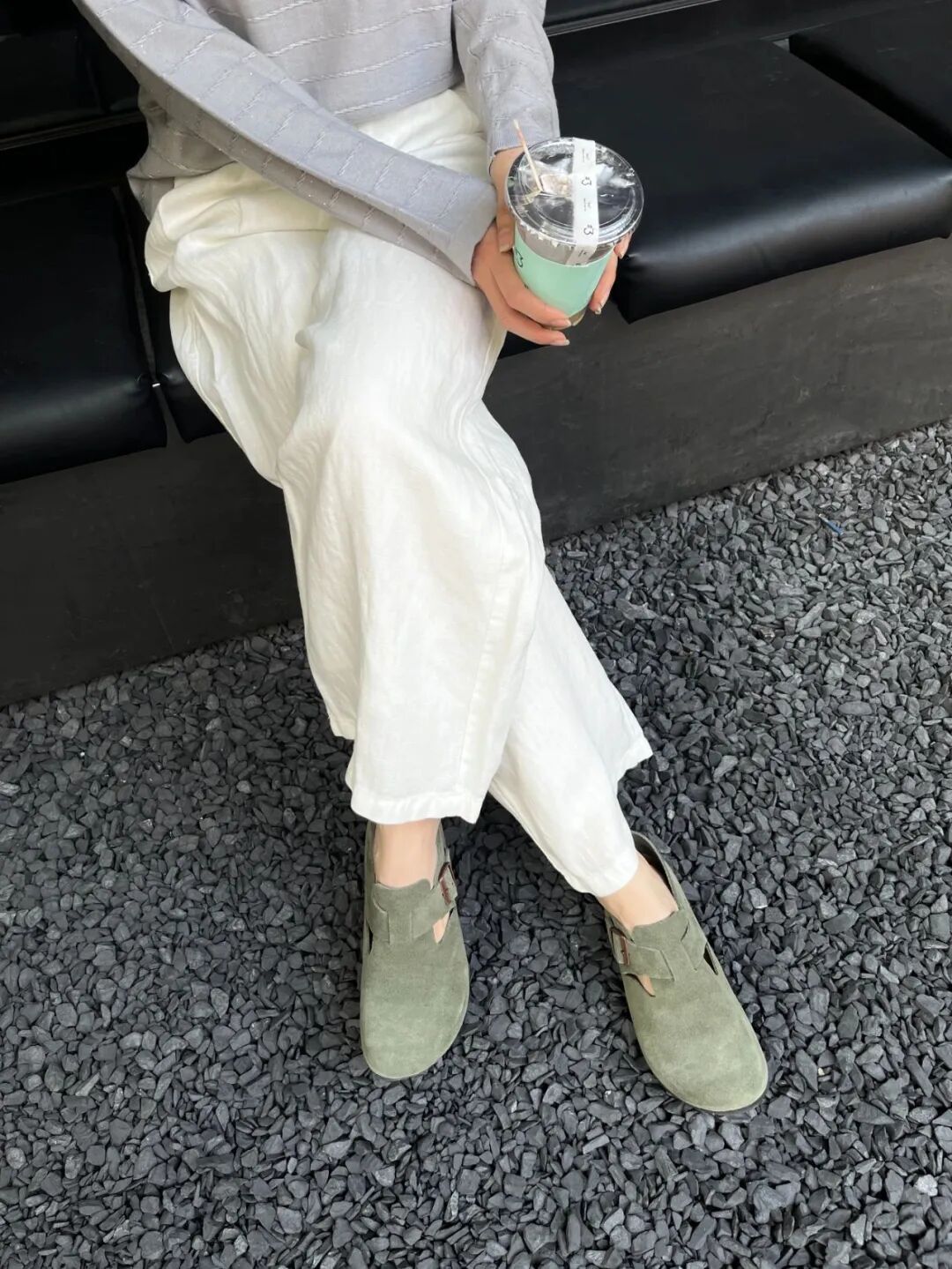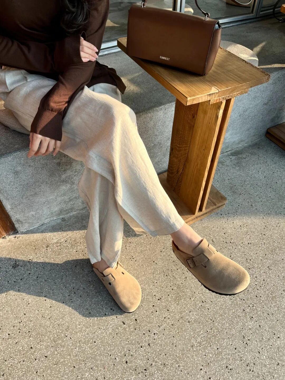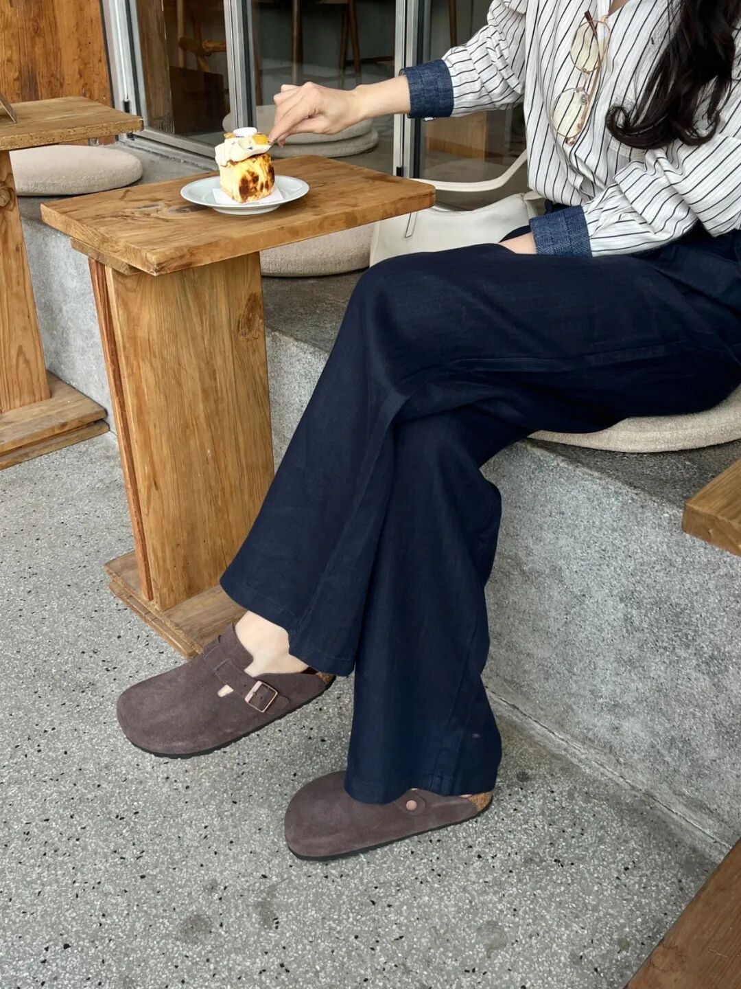 穿一条阔腿裤盖住鞋面,一点也看不出来是拖鞋。