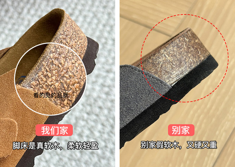 注意,市面上很多声称是“软木”的,实际上都是用稻糠屑来冒充的,穿着又硬又重。❌