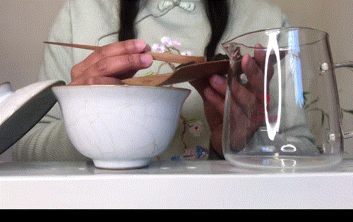 将称好的8克《藏月》投入汝窑盖碗中,盖上盖,闷10-20秒。这样做一是可以将茶叶实现从冷到热的变化,二是可以激发茶叶的香气物质。