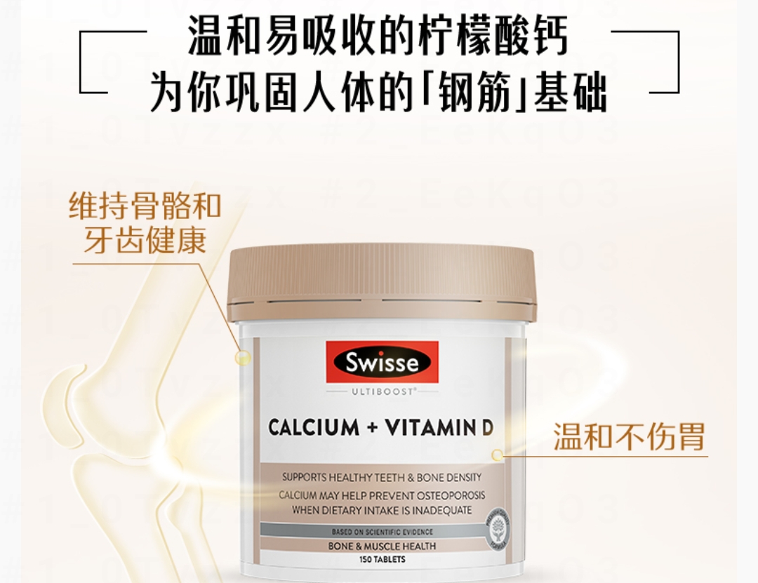 钙片促进骨质再生!柠檬酸钙 Swisse斯维特澳洲钙+维生素D:不添加激素,温和不伤胃,坚韧骨骼牙齿的健康、中老年骨关节不适、骨质流失以及孕期都可补充的一款钙片,有机柠檬酸钙有助于骨骼中的钙吸收,特含维生素D3维持正常的血钙和磷平衡。