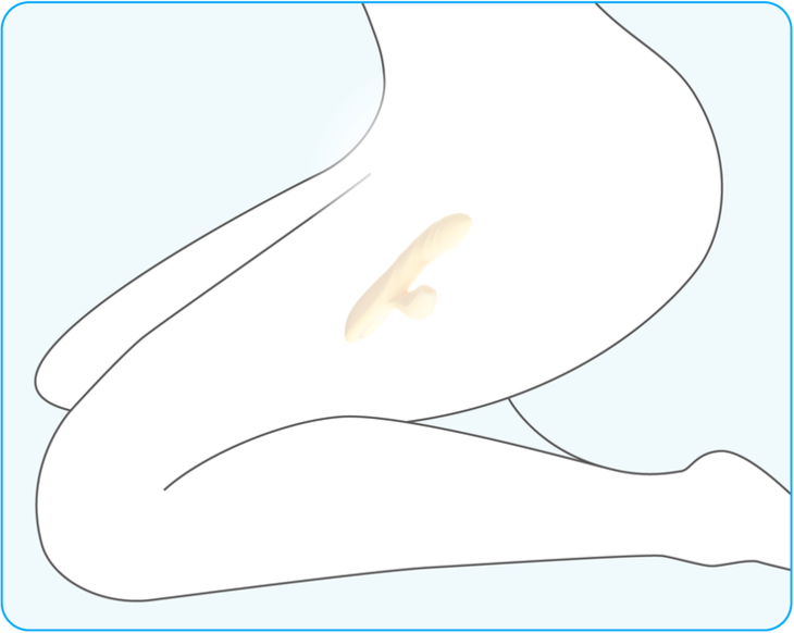 ① 侧卧位躺在床上,震动端对准豆豆,开启热身,同时入体端进入约1/3,不要开启伸缩功能,先尝试手动进出;