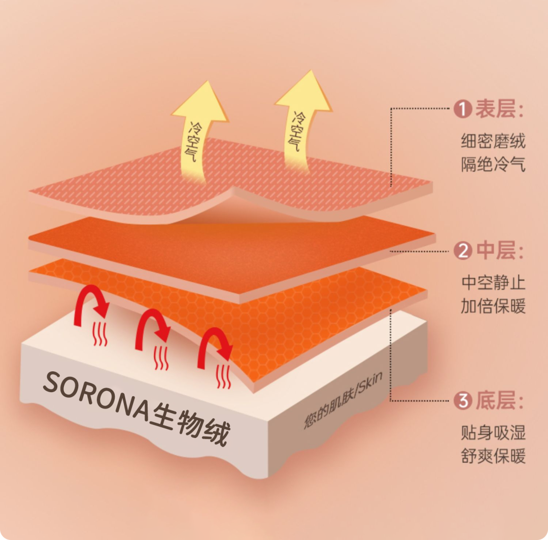 可以毫不夸张地说:1件生物绒保暖效果=3件保暖内衣!它只有一件秋季普通内衣的厚度!冬天穿它轻盈不臃肿!