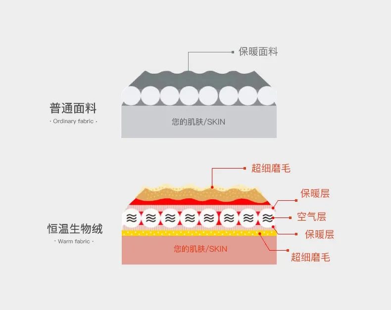 普通纯棉面料纤维结构难以抵御热量流失,只能通过更厚更多的面料克重来实现保暖效果。而阳离子恒温生物绒进行特殊工艺磨毛处理,形成异形螺旋结构,将空气牢牢锁住,从而防止热量流失。