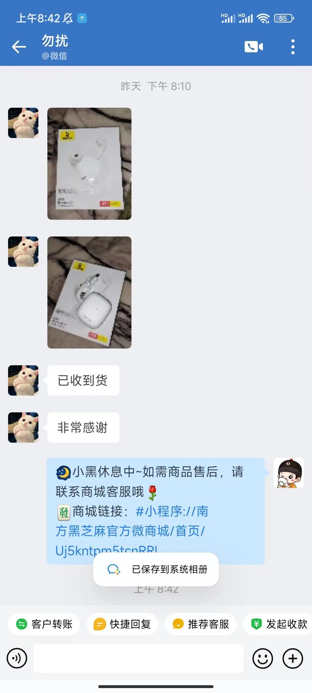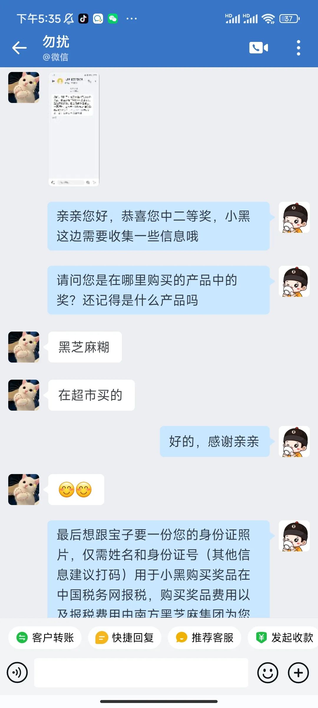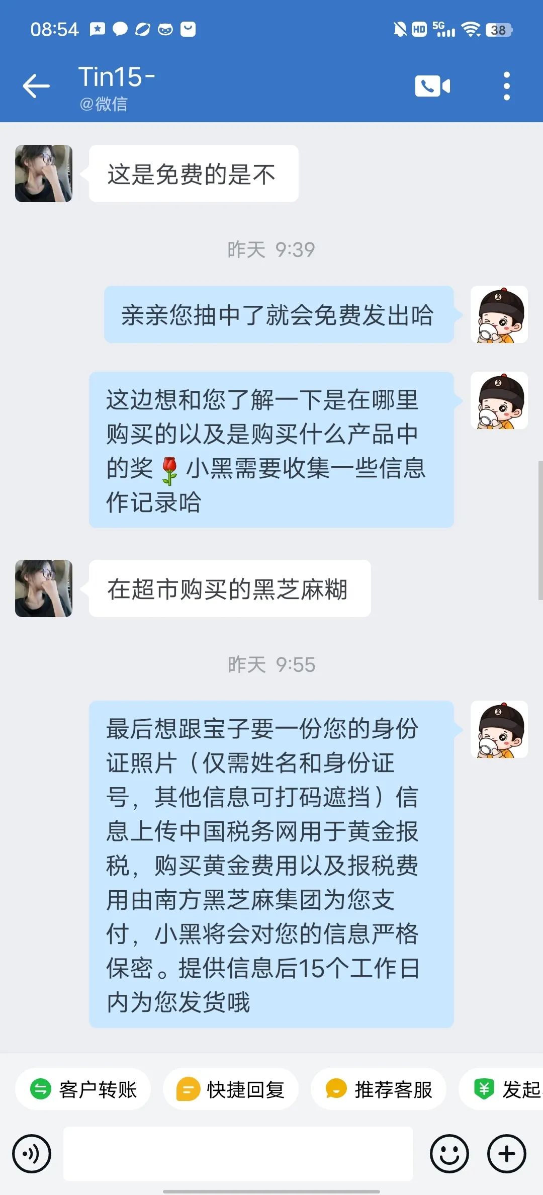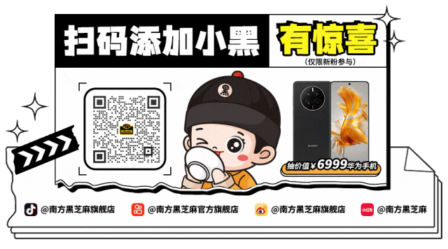 用户中奖后需通过成功添加的南方黑芝麻官方客服企业微信号“小黑”进行对接沟通实物奖品兑奖,并提供获奖者姓名、身份证信息用于代扣代缴个人所得税,实物奖品会在兑奖后15个工作日内包邮寄出(港澳台地区除外)。如在中奖之日起30日内未在南方黑芝麻官方客服企业微信号“小黑”私信联系进行兑奖,将视为自愿放弃奖品领取。