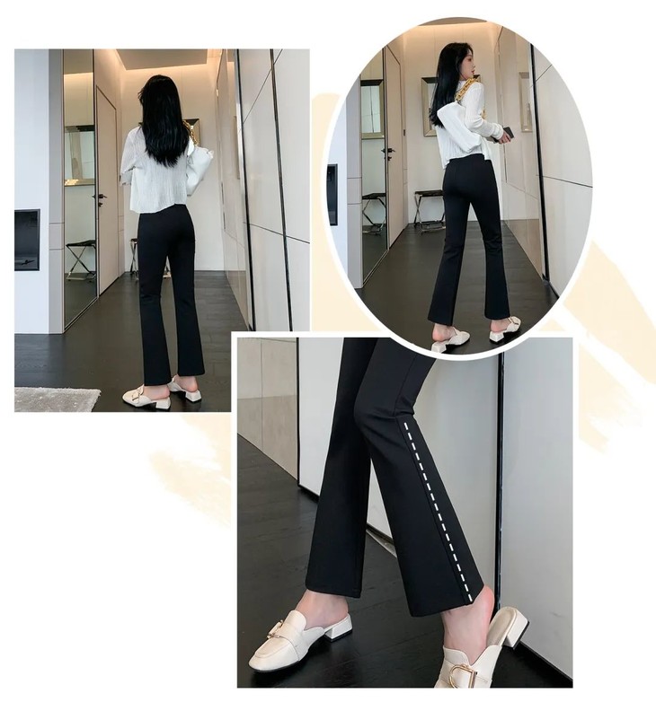 侧面看小腹部分不会像别的裤子一样鼓起来一块,非常平整。裤子后面是松紧腰,隐藏式设计,不影响美观,包容性又非常好~有小肚子都不怕!包括各个细节也非常有匠人精神,工艺制作上也十分用心,裤子内里做了包边设计,避免脱线问题~整体看起来更加干净利索,完完全全就是大牌的做工,穿上几年完全ok。弹性好!下蹲、上跳,没一点障碍,从80斤-144斤都可以穿!透气性也是一绝,春天穿很舒服,夏天穿着也不会闷热,如同走路带风,英姿飒爽。平整的走线以及有质感的面料,上身后立马穿出一种高级感。上身后就像大瀑布一般猛然垂下,把肉悄悄藏在了“水帘洞”里~设计简约大气,灰常百搭,属于穿10年都不会过时的那种。一条喇叭裤就能穿四季,没有天气的限制,想怎么搭配就怎么搭配。【开叉九分款】+【不开叉九分款】建议165cm以下身高。以上身高的建议,实际以个人身材比例而定哈,裤子包容性很好不挑身材的。软磨硬泡半个月,向品牌争取到了超优惠的价格,两位数就可以拥有它啦。优惠价格只有300个名额,售完即恢复原价三位数~喜欢的现在就可以下手啦!入手不亏,诚意满满,如果你之前一直没遇到合适你的开叉裤,那这条值得一买,试穿后就知道差别在哪里啦!