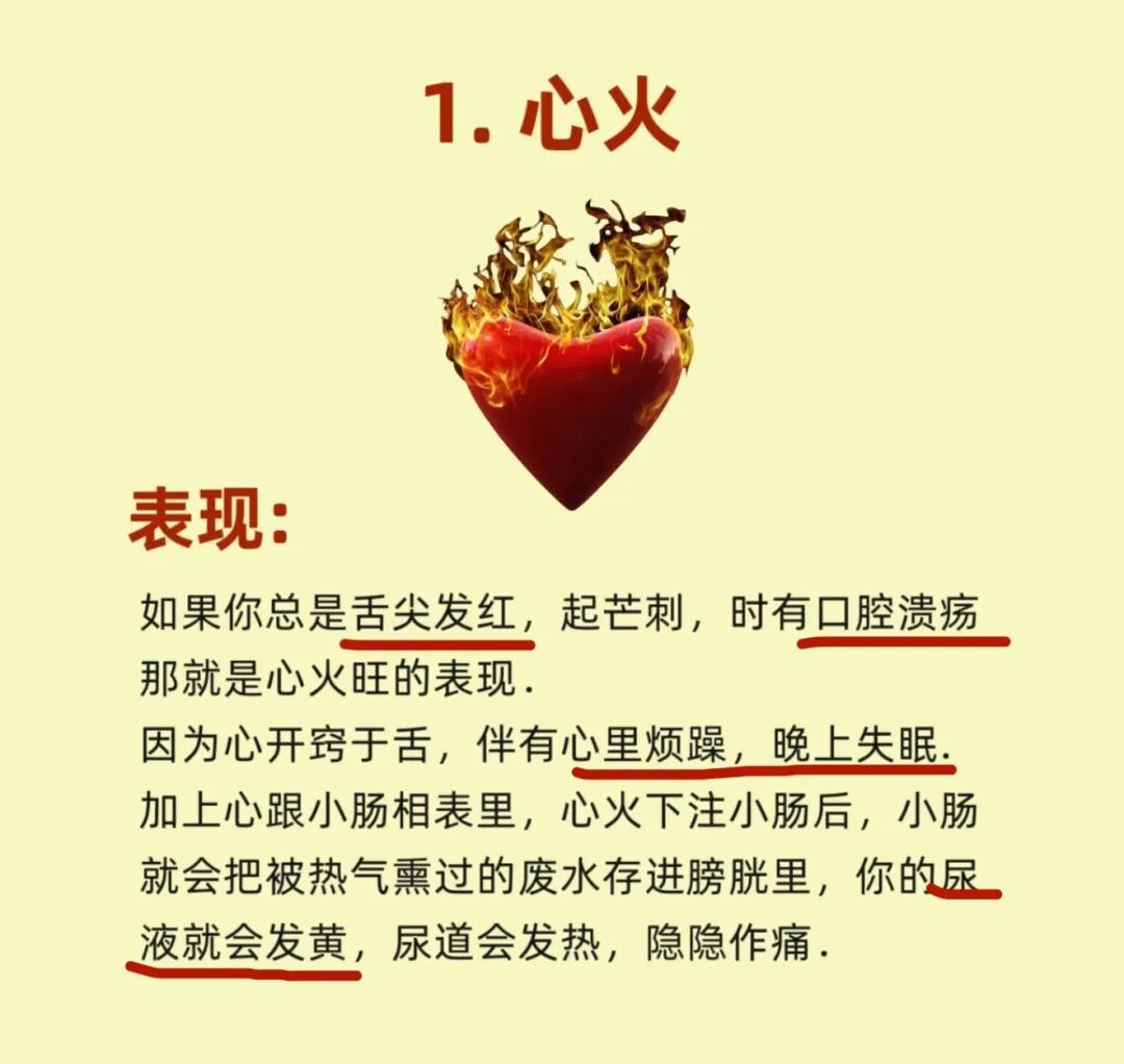 心火太旺容易内热、心烦、失眠👇,还会伤及咱们的肺和肾。