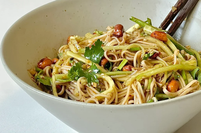 捞出凉面打底,加入黄瓜丝、油炸花生、再加入万能料汁,搅拌均匀,最后加入牛仔骨,就可以开吃了。