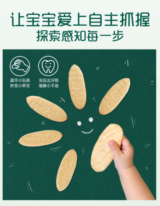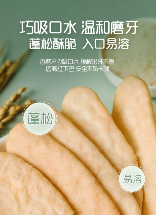 香酥口感,好磨牙易入口,对出牙期的宝宝来说,不仅增加了食物风味,还增加了磨牙好物,可以很好帮助小牙齿萌发。
