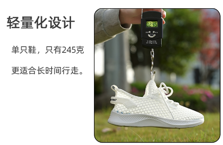 它够轻,充分减轻了自身重量,通身仅约245g,走再久的路也不易感到累,好穿度甩普通鞋子好几条街!