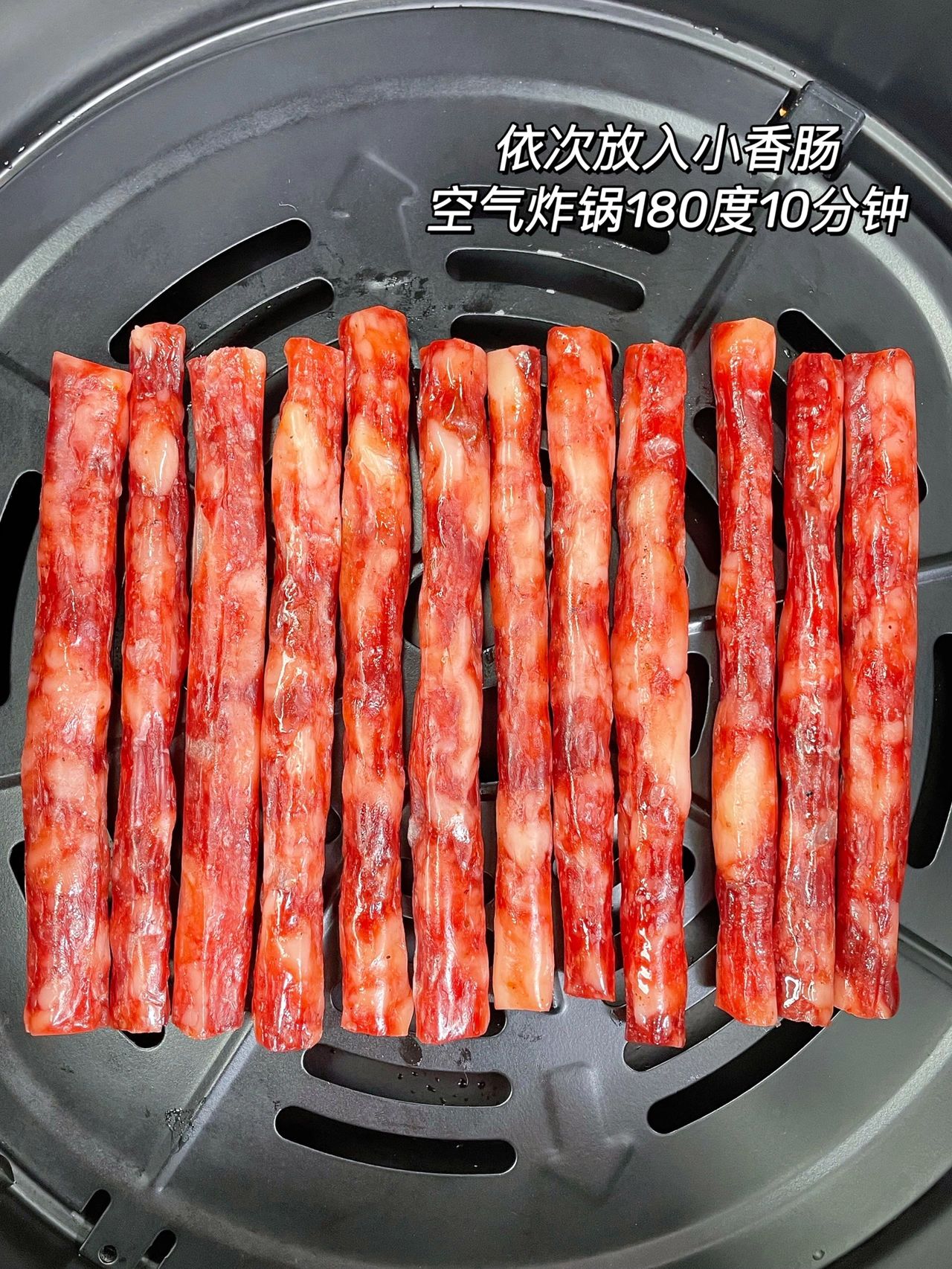 👨🍳做法:小香肠放进空气炸锅,180度烤10分钟,中途记得拉出来看一下,如果不喜欢太焦的,可以8分钟,不用刷油,直接烤