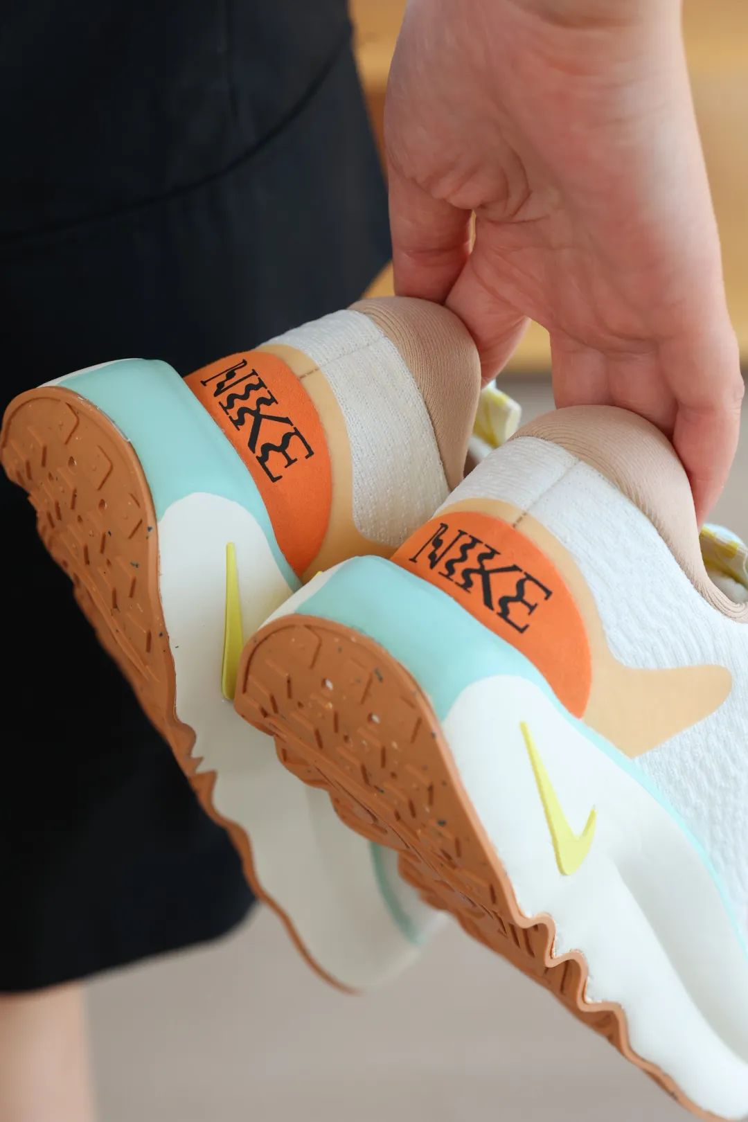 波浪形弯曲凹凸外底提供耐磨性和牵引力,对于站立,行走都提供了一种极其舒适,稳定且能推动步伐向前的穿着感。