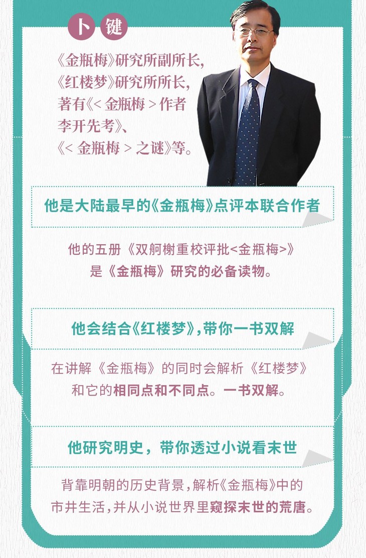 课程一共50节,卜键老师会陪伴着你一起读好《金瓶梅》。