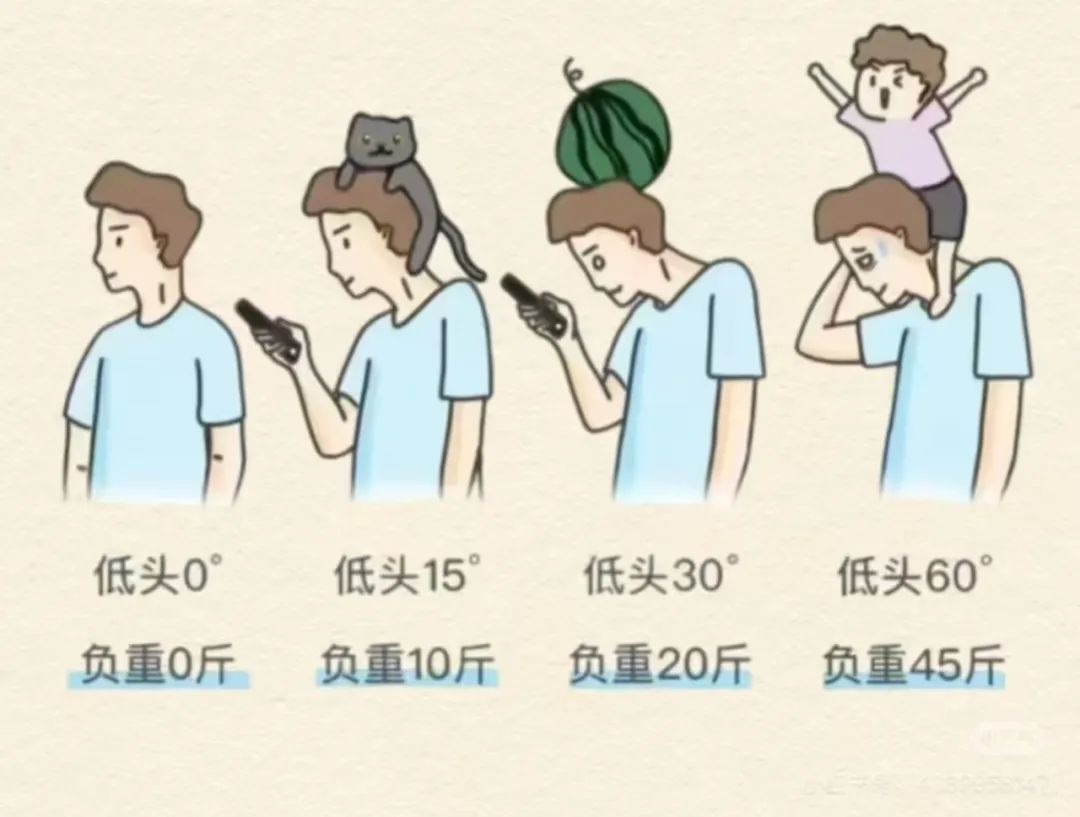 人的头部重量≈10斤(相当于5瓶矿泉水),而低头60度时,颈椎承重高达45斤!