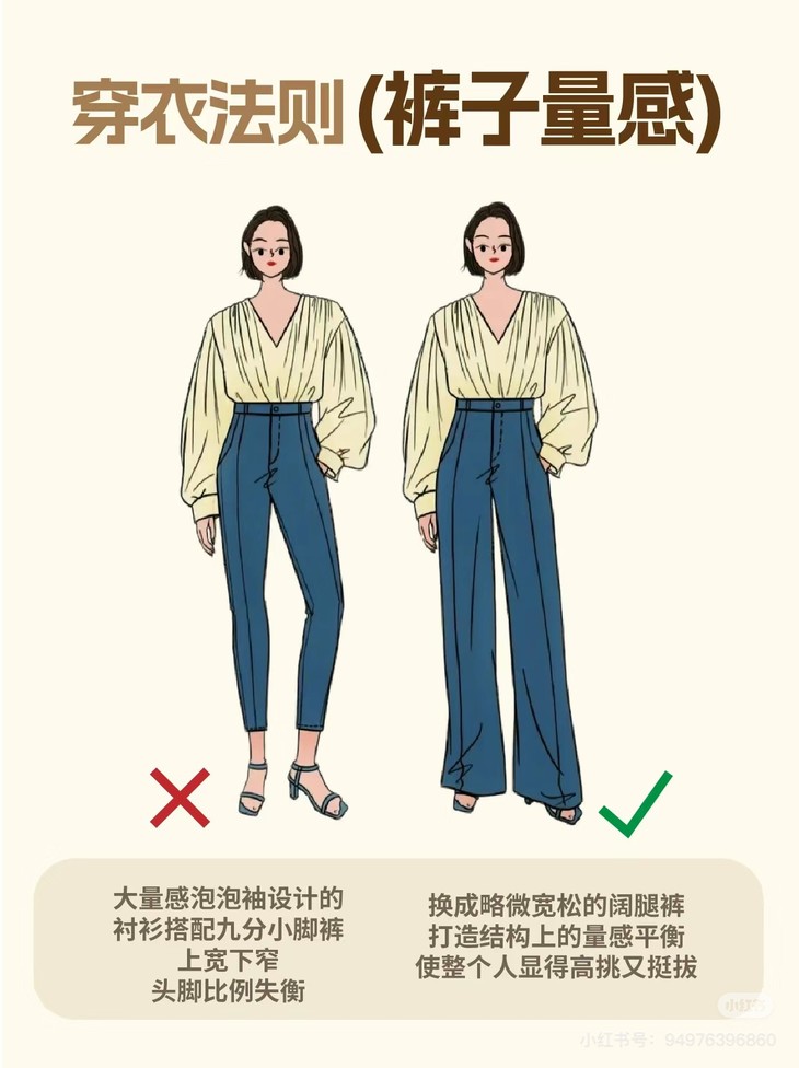 柔和量感的浅蓝色小衫搭配厚重的黑色下装,头重脚轻;裤子换成垂白色,色彩平衡和协调了很多,整体风格更加柔和。