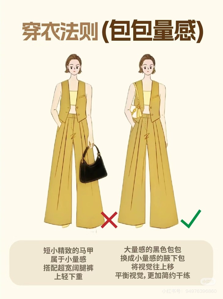 短小精致的马甲属于小量感,搭配超宽阔腿裤,上轻下重大量感的黑色包包,换成小量感的腋下包,将视觉往上移,平衡视觉,更加简约干练。