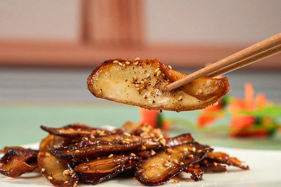 杏鲍菇切成薄片,然后煎制到焦黄,撒上孜然、调味料和白芝麻就完成了,嚼起来很有口感,嘴馋时做它真的再合适不过~