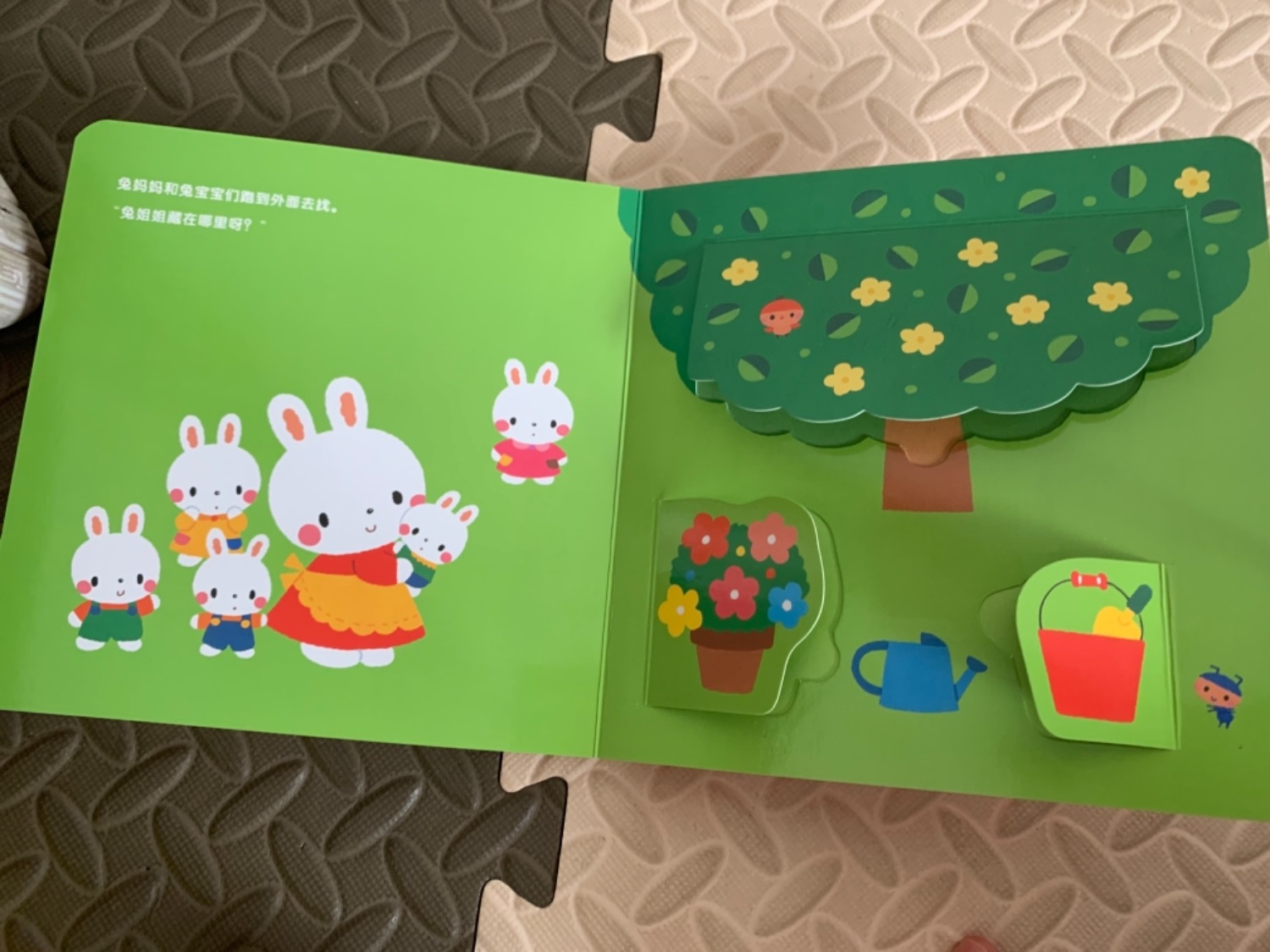 《猜猜我在哪》主角兔妈妈和6只小兔子,她们在玩捉迷藏。12个花样翻页,很有趣。