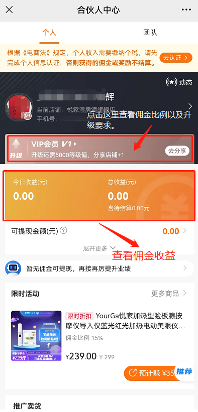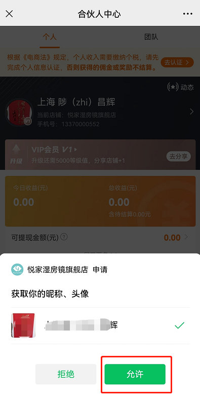点击允许,即可直接成为悦家合伙人,在合伙人中心,可以查看自己的佣金合伙人等级等。