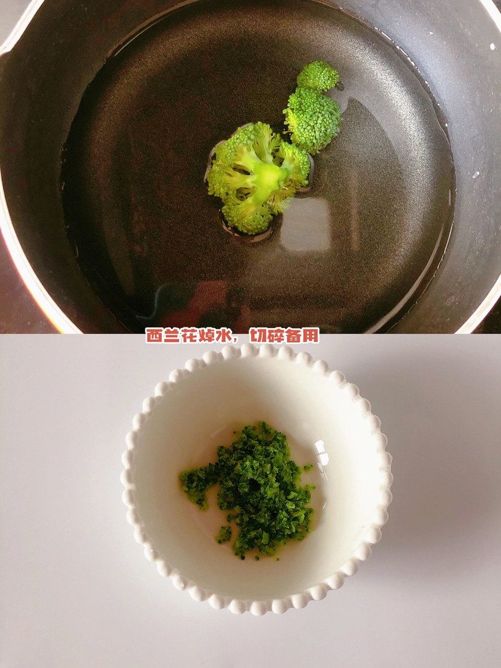 4.白萝卜、西兰花、虾皮挤干水分少量多次倒入低筋面粉、玉米淀粉搅拌均匀