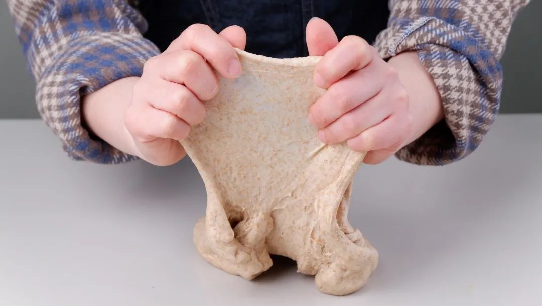 搅拌形成粗膜后,加入黄油,进行最后的搅拌,搅拌至形成较光滑的薄膜