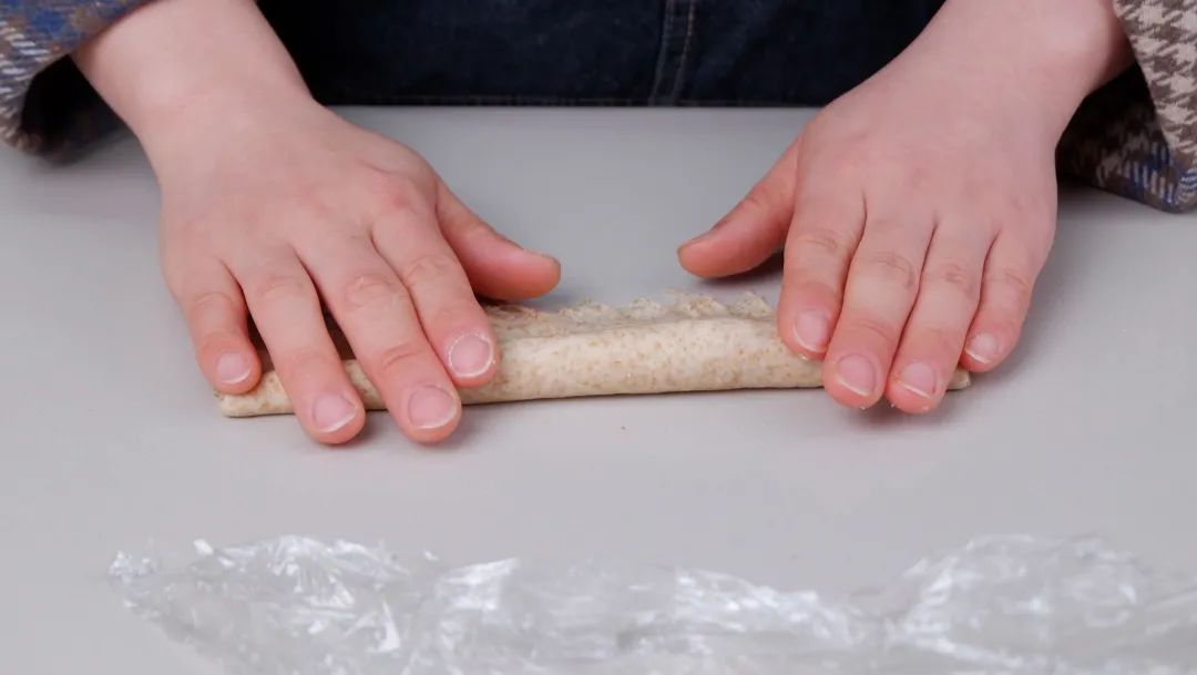 将一端擀成薄片,擀薄片的一端包裹另一端面团