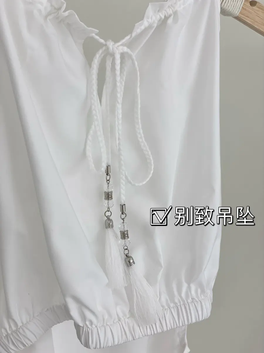 领口后面点缀了精致的流苏挂坠装饰,增加金属时尚感;同时下摆还做了流苏细节,增加些许民族风情~